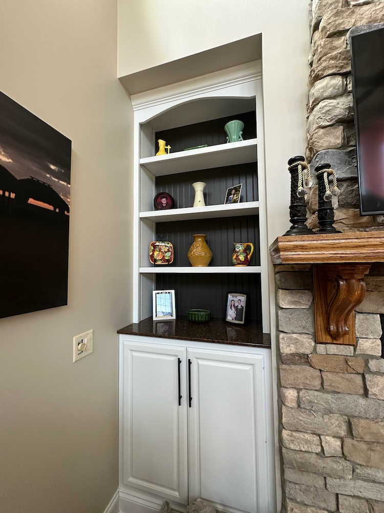 We used Sherwin-Williams Urbane Bronze (SW 7048)—a deep, rich shade that was named Color of the Year not long ago. Against the neutral Accessible Beige walls, the Urbane Bronze backing creates a striking contrast and makes books, artwork, and décor pieces pop. It’s a small detail that delivers an outsized design impact.