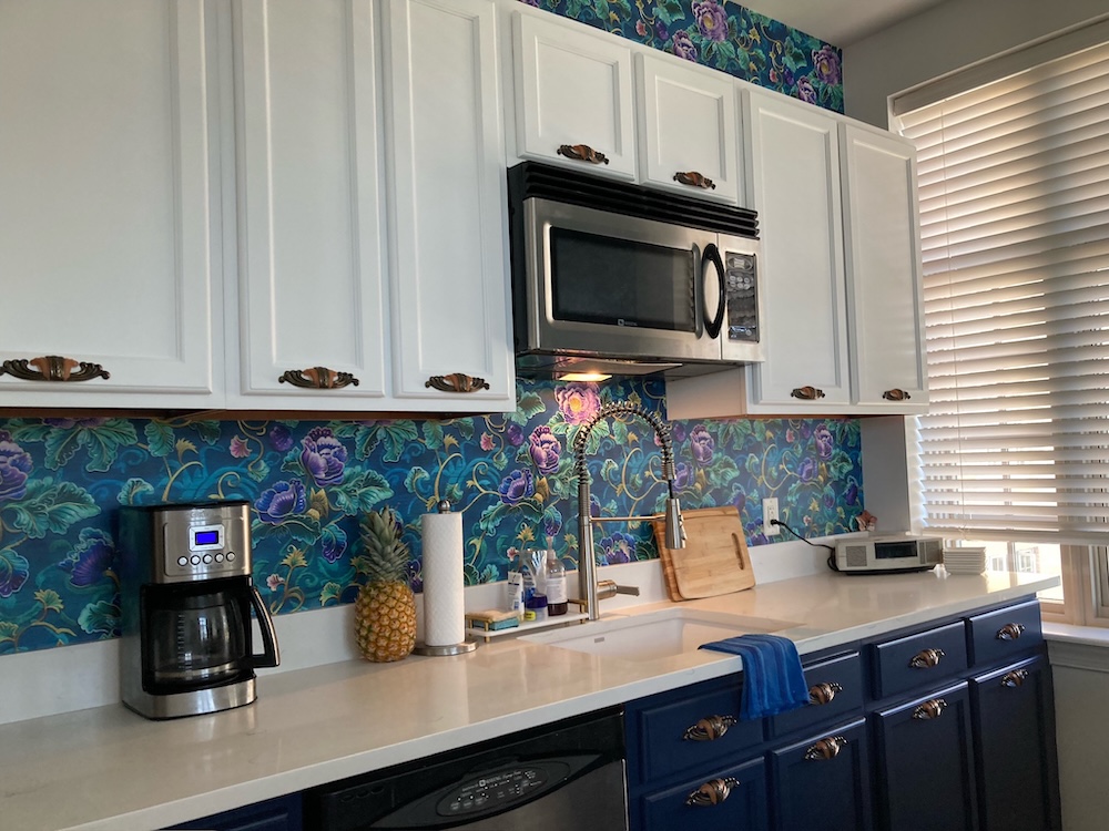 The goal? A two-tone kitchen featuring bright white upper cabinets and rich Sherwin-Williams Naval on the bottoms. This combination would tie in perfectly with the stunning wallpaper she had already picked out (and purchased, because she’s a planner after our own hearts).