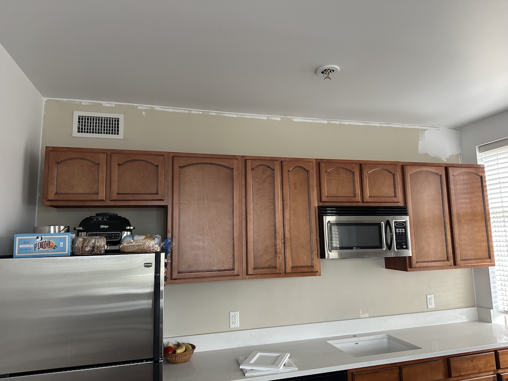 Normally, our preferred method for cabinets is to spray everything. It gives the most consistent, smooth-as-glass finish possible. But our customer had one very reasonable concern—her kitchen was in a townhouse, and space was tight. Like, “Rich could touch both walls at once” tight.